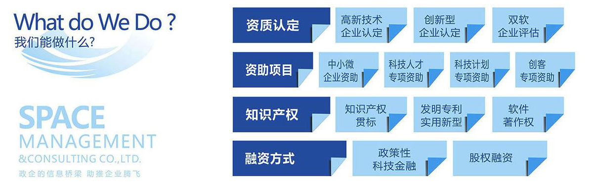我们专注于为科技型企业提供政府资助项目申报辅导、国家高新技术企业认定、专精特新企业、知识产权代理、软件企业评估、项目可行性研究等综合性服务,最大限度地利用团队智慧和市场优势为客户提供最优质的服务,助推客户企业快速腾飞。