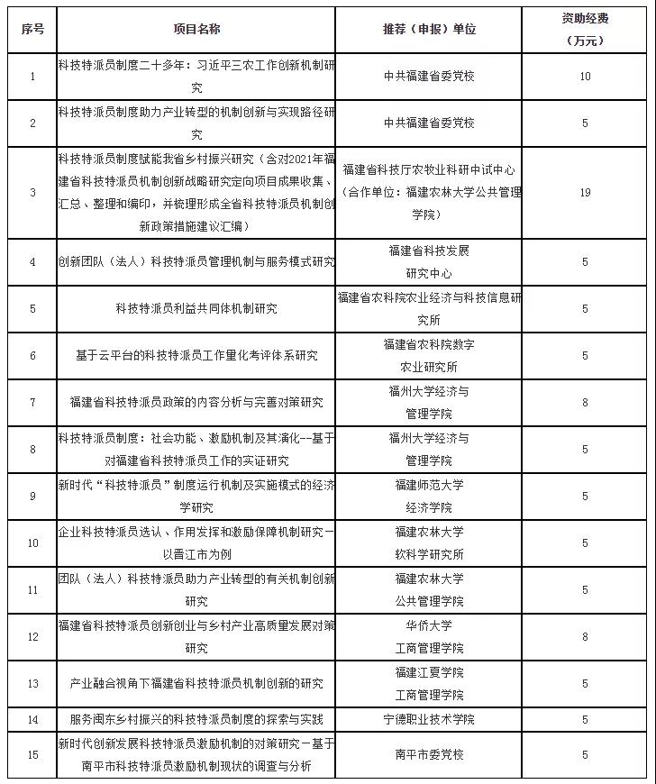 (一)2021年福建省科技特派员机制创新战略研究定向项目名称、推荐(申报)单位及申请资助经费限额详见下表: