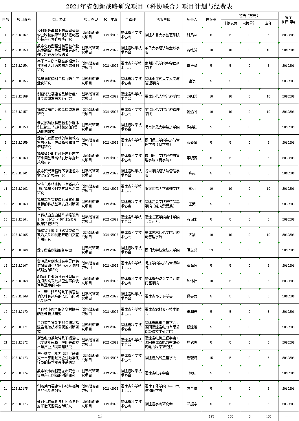 经研究决定,将“乡村振兴战略下福建省智慧农业科技成果转化路径与高科技产业集群打造研究 ”等25个项目列入2021年度福建省创新战略研究第一批联合项目计划,资助经费150万元。本批项目经费由省科协负责资助,具体项目和列支科目详见附件。