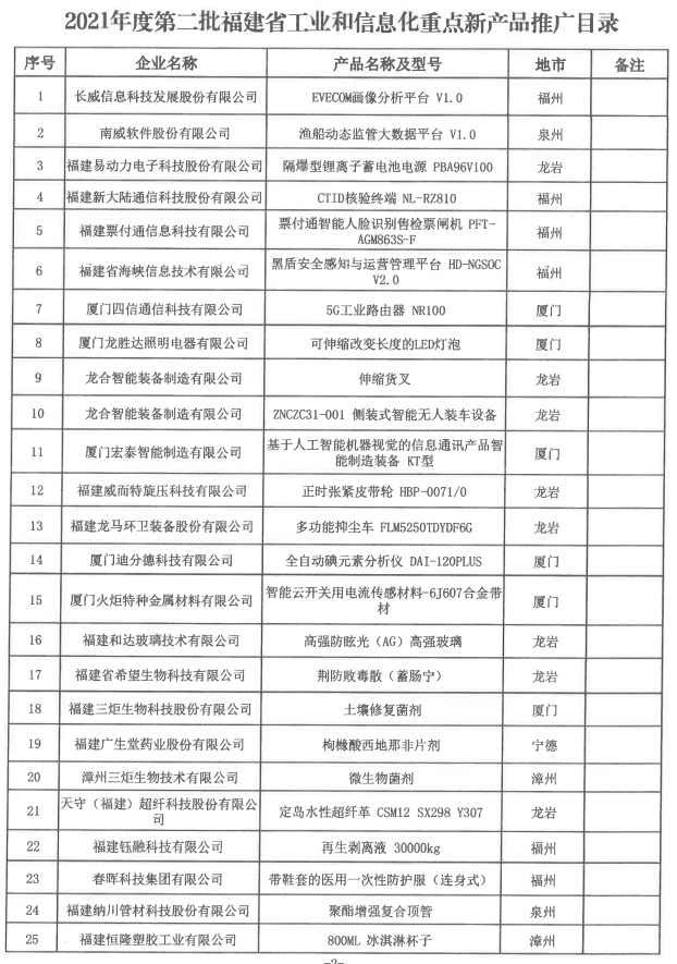 福建省公布2021年度第二批福建省工业和信息化重点新产品推广目录