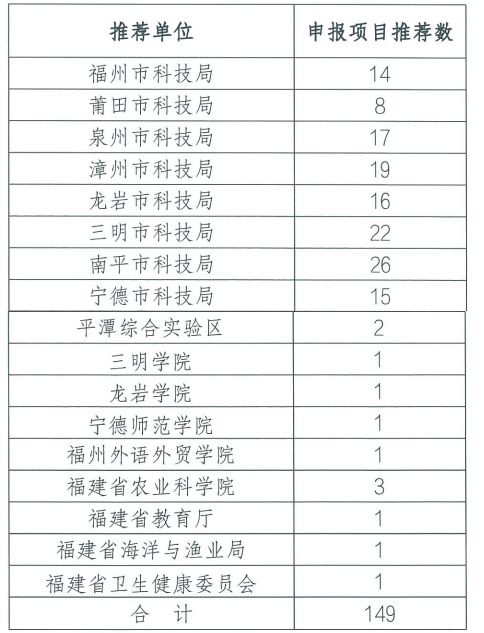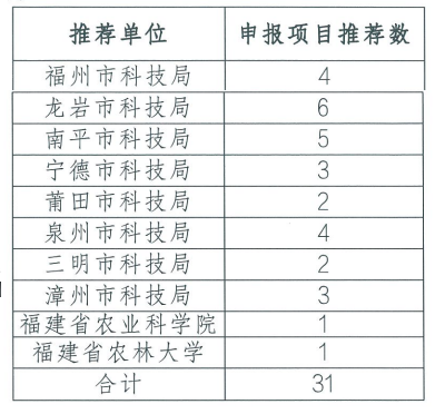 申报数不超过各设区市和平潭综合实验区、省直部门推荐选认的省级法人(团队)科技特派员数量的20%.小于1项的可限额推荐1项。设区市和平潭综合实验区科技特派员联席会议办公室(科技局)、高校和省直有关单位为推荐单位,负责推荐属地(部门)申报项目。