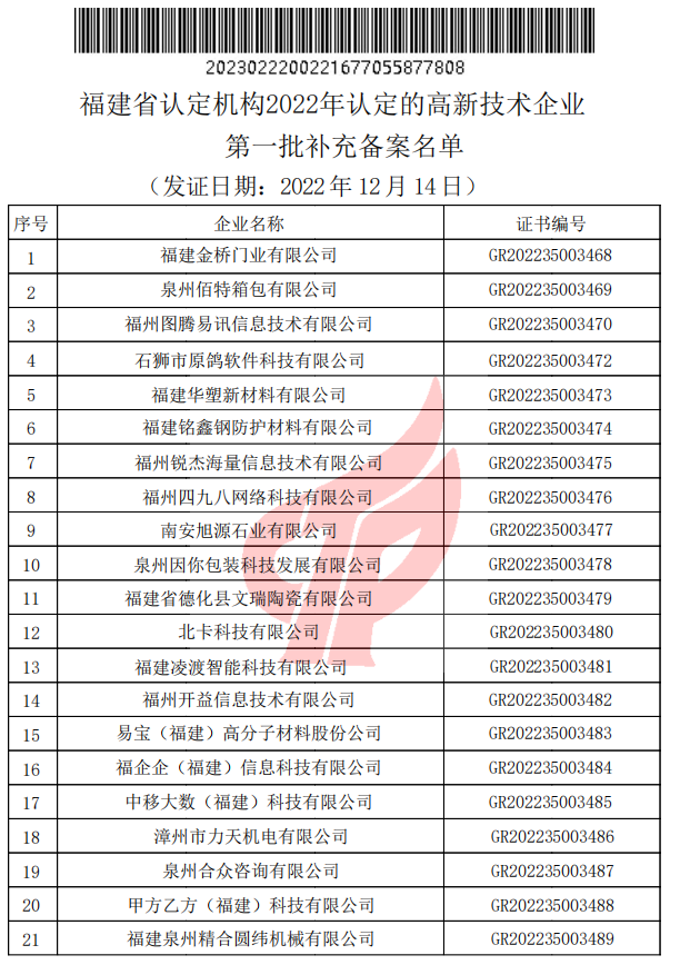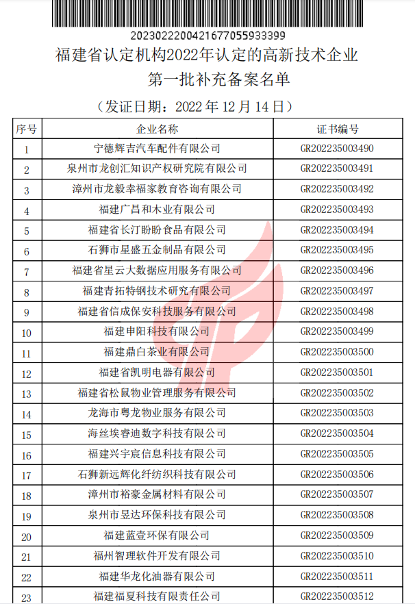 关于对福建省认定机构2022年认定的高新技术企业进行第一批补充备案的公告