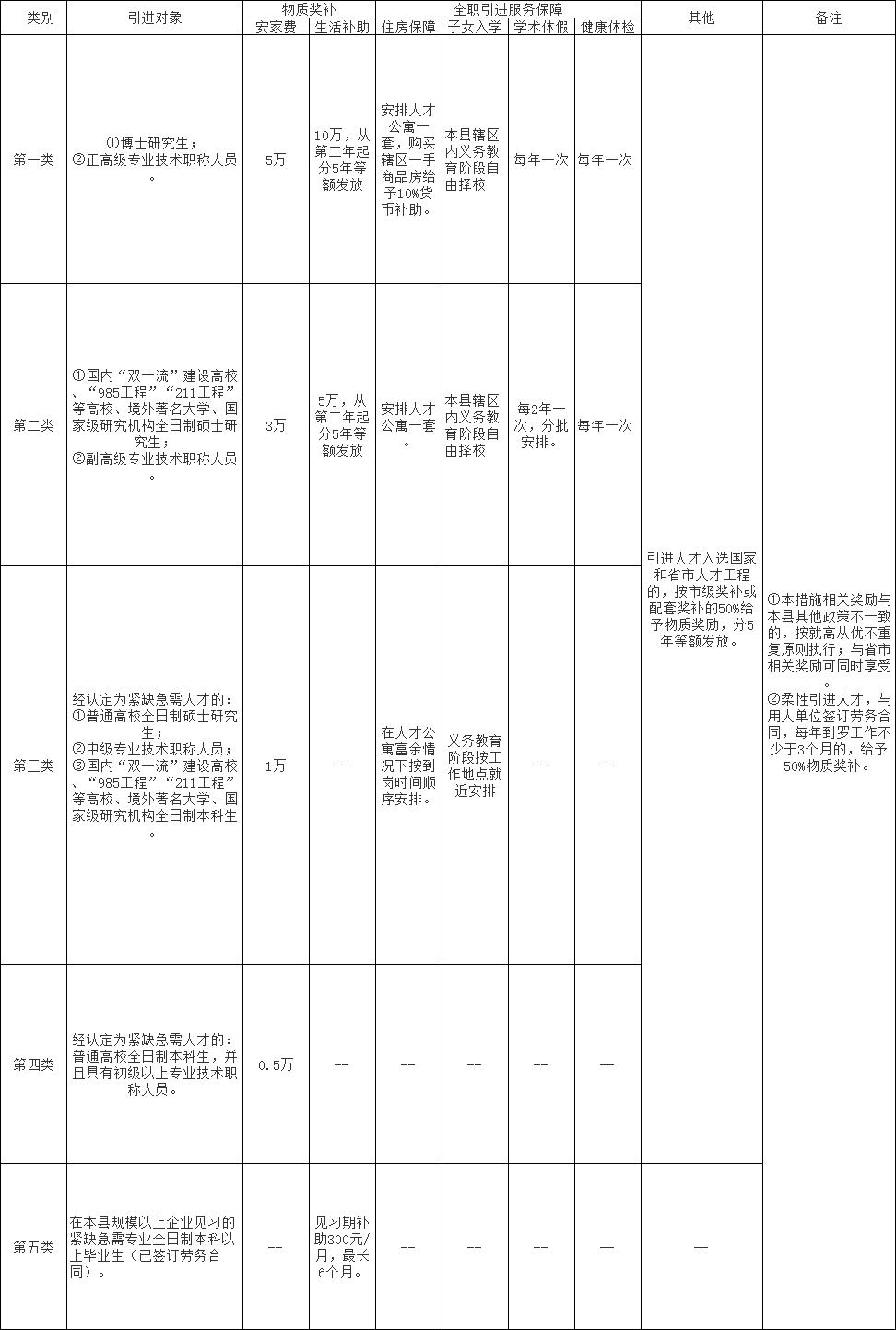 (3)服务保障:安排人才公寓一套过渡使用,购买辖区新建商品房给予10%货币补助;义务教育阶段子女可在本县辖区内自由择校;每年安排一次学术休假和健康体检。