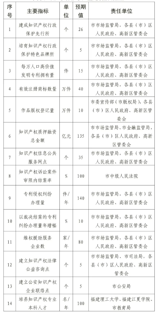 责任单位:市市场监管局(知识产权局),市委组织部市委统战部,市中级人民法院、市人社局、市教育局,各县(市)区人民政府、高新区管委会,福建理工大学、福建江夏学院