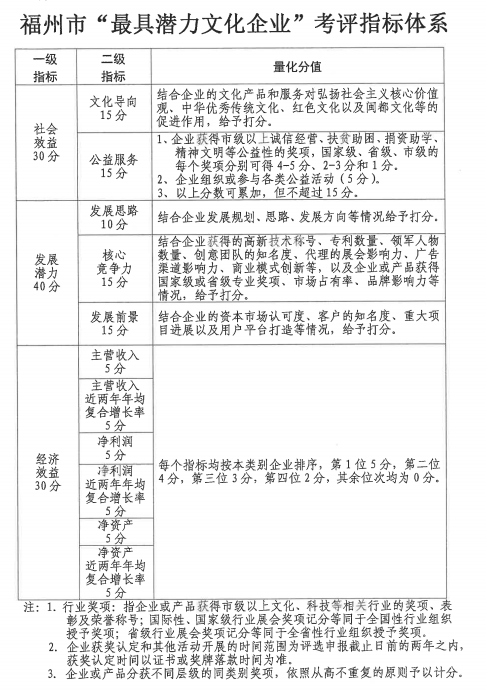 (2)申报福州市“最具潜力文化企业”的企业,依据《福州市“最具潜力文化企业”考评指标体系》自评企业社会效益和发展潜力指标得分(满分70分)。