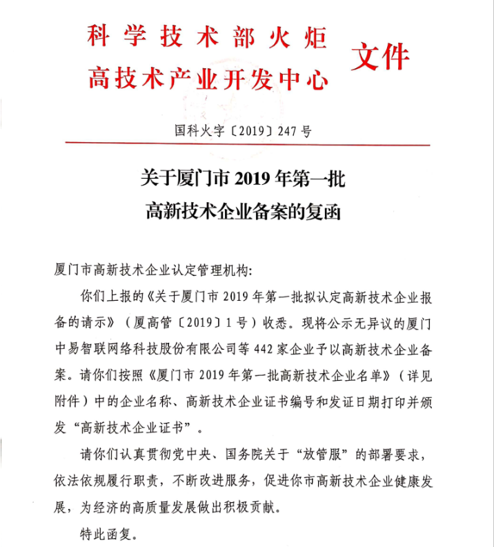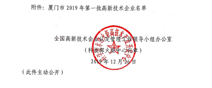 厦门市2019年第一批国家级高企获国家高企认定办批复