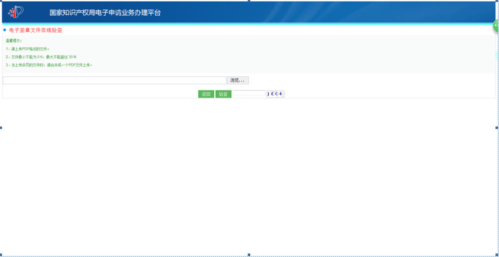 在上述界面,上传带电子签章的PDF电子专利证书文件,输入验证码,点击“验签”按钮,系统即可返回电子签章文件的相关信息。点击“返回”按钮,界面返回到登录界面。(2)验签不通过:电子文件验证未通过(显示校验未通过信息);(3)网络不通或其他问题:验证未连接成功,请稍后重试(显示网络不通提示信息)。