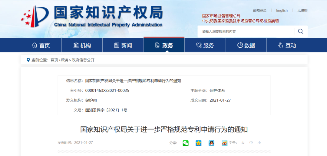 1月27日,国家知识产权局发布关于进一步严格规范专利申请行为的通知中显示:调整专利资助政策。2021年6月底前要全面取消各级专利申请阶段的资助。各地方不得以资助、奖励、补贴等任何形式对专利申请行为给予财政资金支持。地方现有资助的范围应限于获得授权的发明专利(包括通过PCT及其他途径在境外获得授权的发明专利),资助方式应采用授权后补助形式。资助对象所获得的各级各类资助总额不得高于其获得专利权所缴纳的官方规定费用的50%,不得资助专利年费和专利代理等中介服务费。对于弄虚作假套取专利资助的,应限期收回已拨付资金。“十四五”期间,各地方要逐步减少对专利授权的各类财政资助,在2025年以前全部取消。各地方要着力优化专利资助相关财政资金的使用管理,强化专利保护运用,重点加大对后续转化运用、行政保护和公共服务的支持。