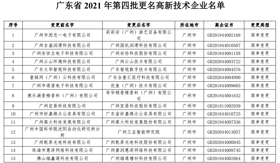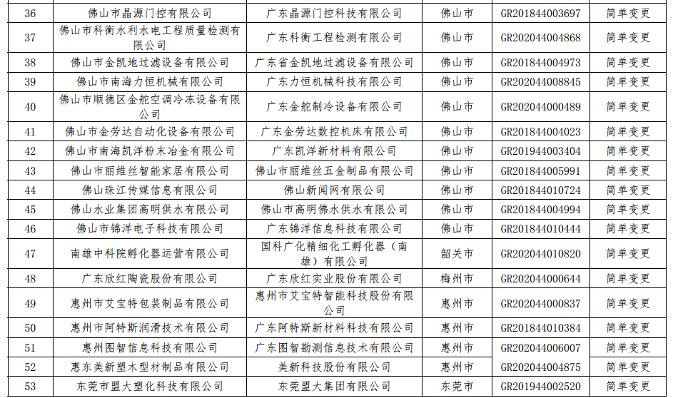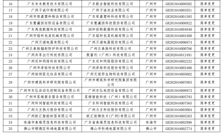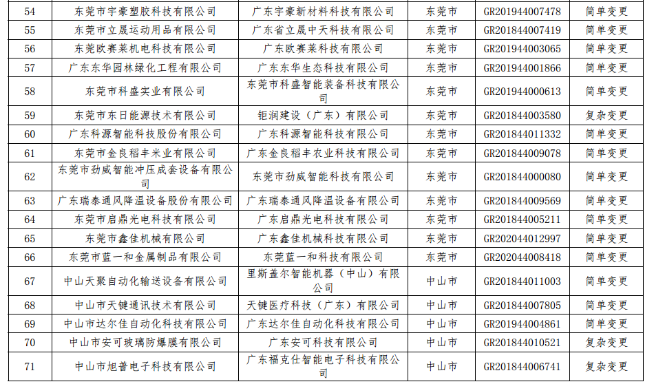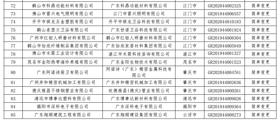 根据《科技部财政部国家税务总局关于修订印发〈高新技术企业认定管理办法〉的通知》(国科发火〔2016〕32号)和《科技部财政部国家税务总局关于修订印发〈高新技术企业认定管理工作指引〉的通知》(国科发火〔2016〕195号)的有关要求,经企业申请、专家评审和公示,广州市阅忠一电子有限公司等85家企业发生变更后仍符合高新技术企业认定条件,现予以公告。