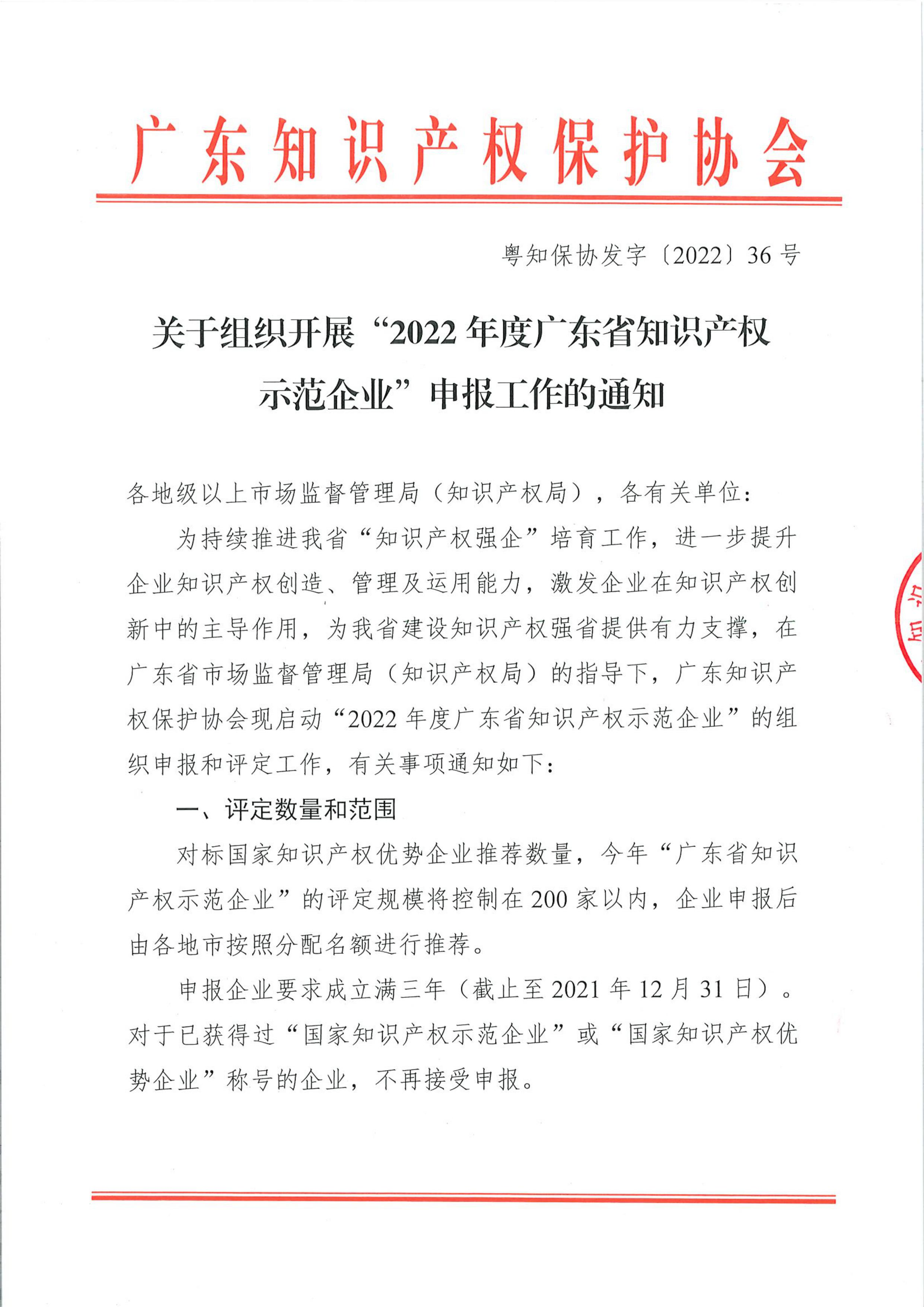 关于组织开展“2022年度广东省知识产权示范企业”申报工作的通知
