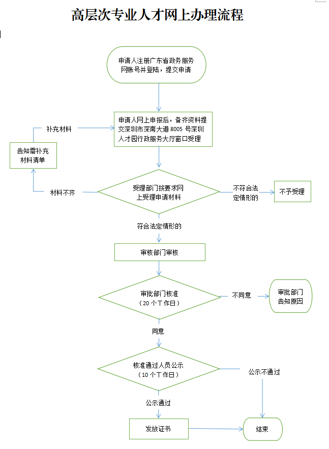 单位经办人持身份证向市人力资源保障局(深圳市福田区深南路8005号深圳市行政服务大厅人才园服务厅综合窗口)递交材料,窗口工作人员网上受理材料,并核对证明材料原件。5个工作日完成。