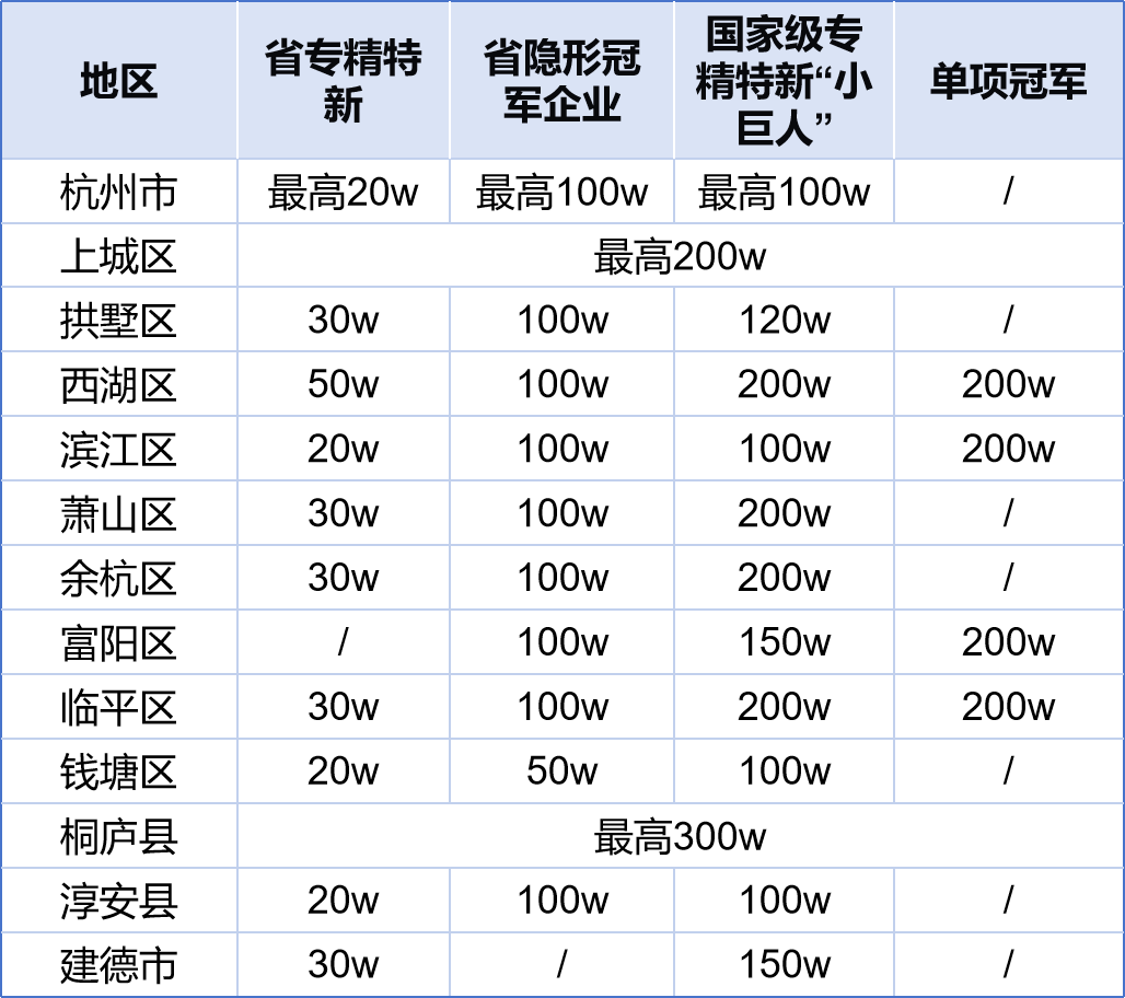 1.对首次认定的省级专精特新中小企业、国家级专精特新“小巨人”企业、省级隐形冠军企业、制造业单项冠军示范企业分别给予不超过20万元、100万元、100万元、200万元奖励。杭州市人民政府办公厅关于印发强化企业科技创新主体地位加快科技企业高质量发展若干措施的通知