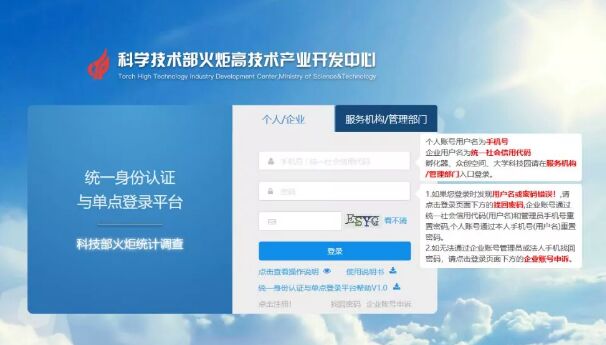 1、进入火炬中心业务办理平台(https://tyrz.chinatorch.gov.cn/hjismp/a/login)