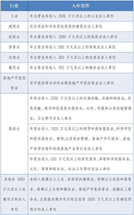 统计范围:规模以上工业、有资质的建筑业、限额以上批发和零售业、限额以上住宿和餐饮业及全部房地产开发经营业等国民经济行业法人单位及所属的产业活动单位,规模以上服务业法人单位,其他有5000万元以上在建项目的法人单位,以及工业生产者价格统计调查样本法人单位。确定以上法人单位的标准为: