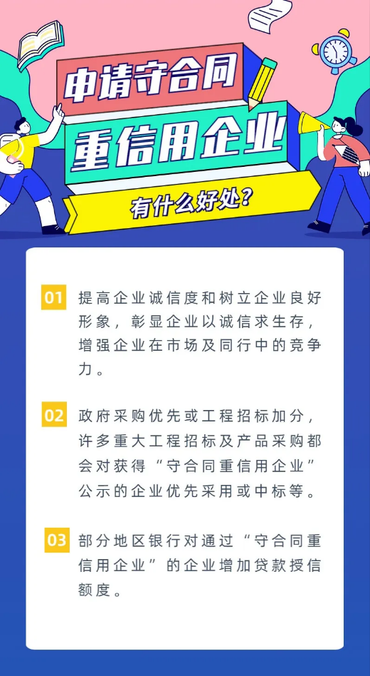 一、2018—2019年度福州市守合同重信用企业申报条件:2017年1月1日前在永泰县行政区域内注册登记并从事生产经营活动,具有一定规模,较好效益,较高信誉度的企业可从即日起至6月30日,采取电话预约、现场提交材料的形式向所在地市场监管所申请报名和提交材料。