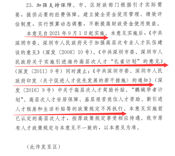 7、并且对2021年9月1日起的新引进人才,取消原有的新引进人才租房和生活补贴申请(深圳市本科每人1.5万元,硕士每人2.5万元,博士每人3万元;各个区里的配套预计会同时调整),预计只有对2021年9月1日及之后新引进入户并在我市全职工作的35岁以下的博士另行制定生活补贴政策,本科和硕士将不再有引进补贴。