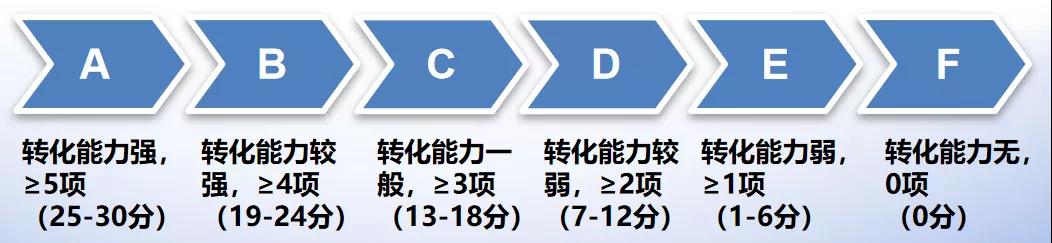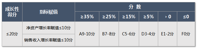 以上两个指标分别对照下表评价档次(ABCDEF)得出分值,两项得分相加计算出企业成长性指标综合得分。