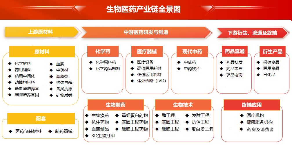 生物医药产业链由上游原材料、中游医药研发与制造、下游衍生、流通及终端三部分组成。上游主要为原材料、配套,涵盖化学材料、血浆、药用辅料、医药包装材料等;中游主要为化学药、医疗器械、现代中药、生物制药、生物技术,涵盖化学原料药、医疗设备、中成药、生物疫苗、酶工程等;下游主要为药品流通、衍生产品、终端应用,涵盖药品批发、保健食品、医疗机构等。
