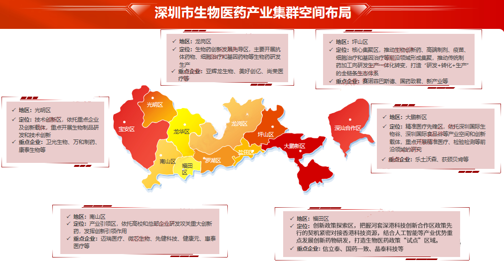 深圳生物医药产业集群主要布局在坪山区、南山区、福田区、龙岗区、光明区和大鹏新区6个区,其中,福田区、南山区重点聚焦创新政策探索和技术创新;坪山区、龙岗区、光明区重点聚焦研发和生产转化;大鹏新区重点聚焦精准医疗、检验检测等前沿领域的研究。