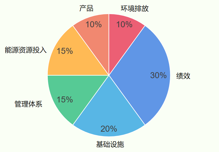 具体讲,绿色工厂评价一级指标包括6大类:基础设施、管理体系、能源资源投入、产品、环境排放和绩效,共细分为25项二级指标,总分共100分,分值占比如下: