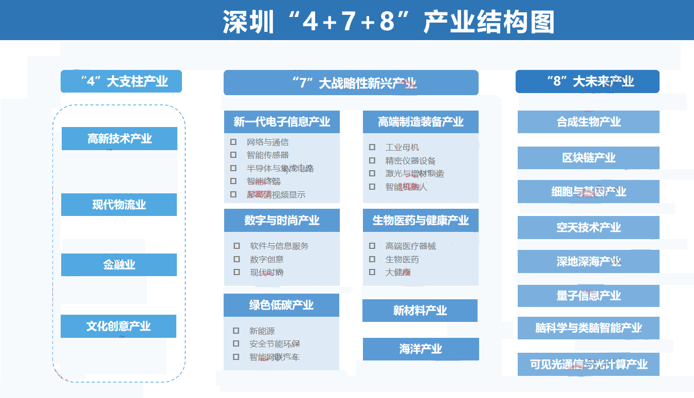 当前,深圳形成四大支柱产业、七大战略性新兴产业、八大未来产业的“4+7+8”产业结构,并着力发展以先进制造业为主体的“20+8”产业集群,建设面向未来的现代化产业体系,制造业不断迈向高端化、智能化、绿色化。