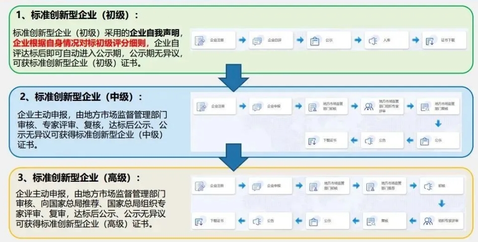 标准创新型企业梯度培育层级由低至高依次为:标准创新型企业(初级)、标准创新型企业(中级)、标准创新型企业(高级)。