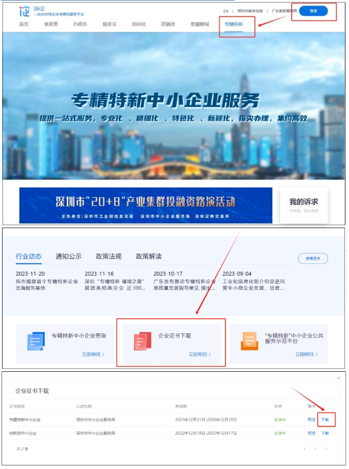 2024 年深圳市专精特新企业电子证书下载网址:https://www.szsiq.com/#/specialized?temp=1708500410418
