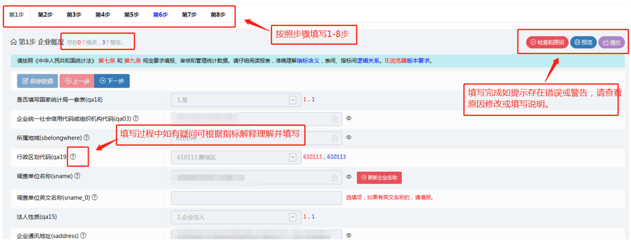 ①按步骤填写1-8步;②填写过程中有疑问,可点击“问号”查看具体指标解释;③填写完成如提示存在错误和警告,请查看原因修改或填写说明。