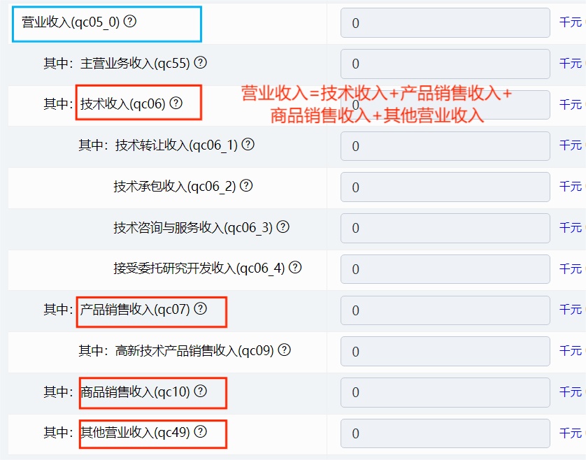 营业收入=技术收入+产品销售收入+商品销售收入+其他营业收入