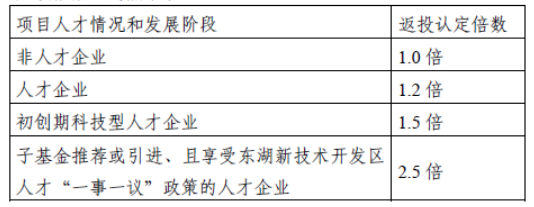 返投认定倍数指子基金投资项目按人才情况和发展阶段进行的加权倍数(对照下表)