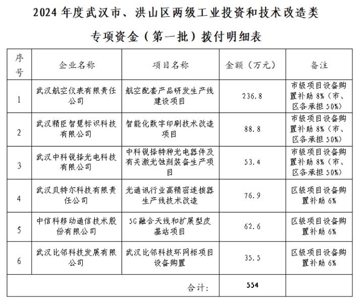 本次专项资金拨付对象是按我局《关于申报2024年度武汉市、洪山区两级工业投资和技术改造类专项资金的通知》进行申报,并符合支持条件的洪山区企业,具体金额见附件。
