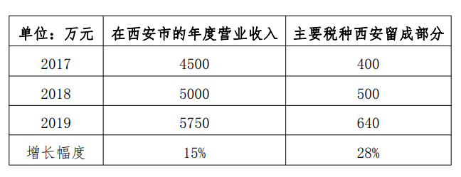 (2)在西安市的年度营业收入和主要税种(增值税、企业所得税)西安留成部分均不低于近三年最高值;