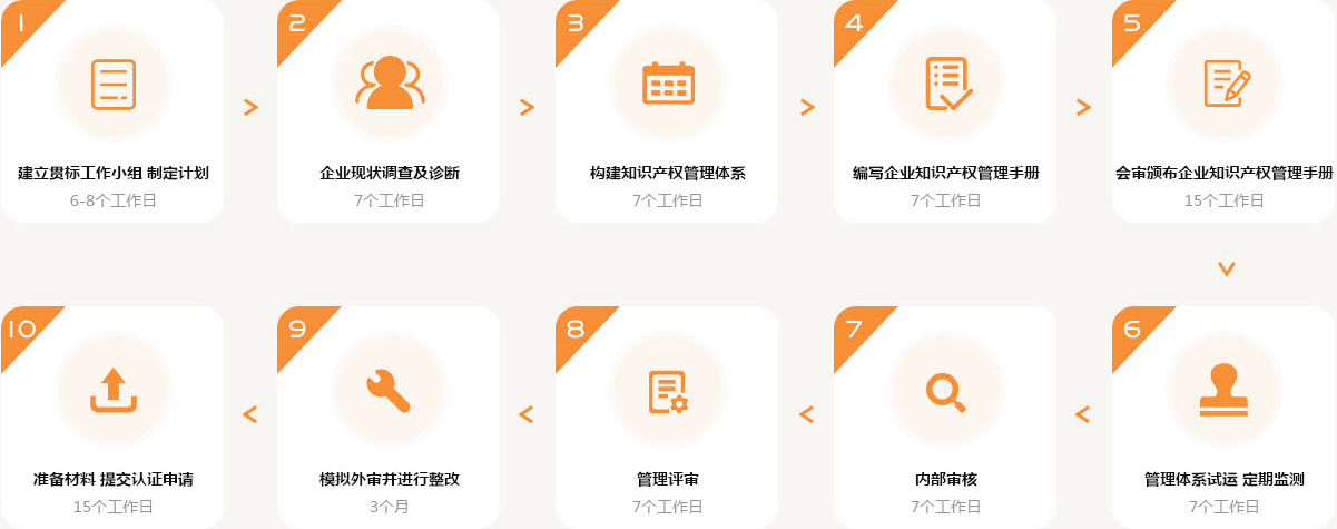 贯标辅导周期在3-4个月,认证周期2个月左右。出于企业的需要与工作安排,全程周期可适当压缩,高效率的贯标进程离不开企业领导重视和各部门参与人员的高度配合。