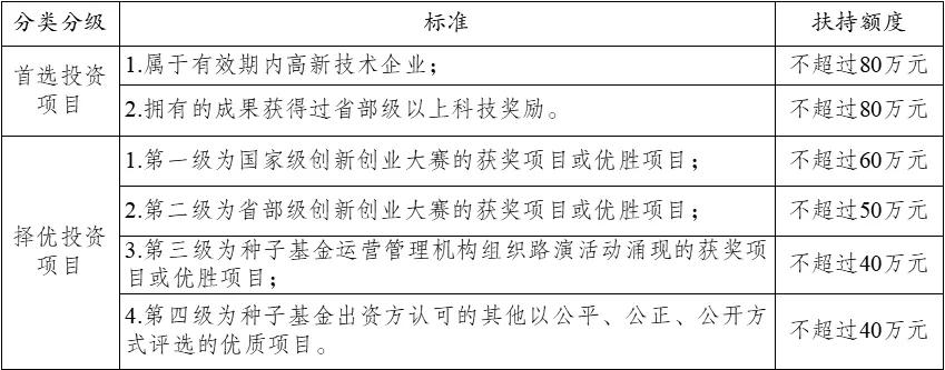 种子基金申请额度不超过80万元,采用分级分类的办法投资项目,优先支持首选投资项目