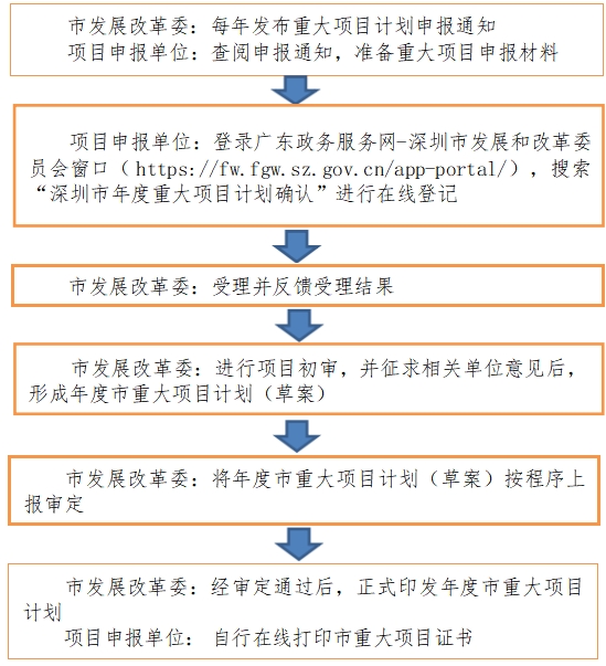本次重大项目计划申报全部采取网络申报,请项目单位通过广东省政务服务网-深圳市发展和改革委员会窗口统一进入,具体网址为:https://fw.fgw.sz.gov.cn/app-portal/,登录后在事项列表中选择“深圳市年度重大项目计划确认”进行申报,而后进入深圳市智慧投资项目管理平台进行在线办理。