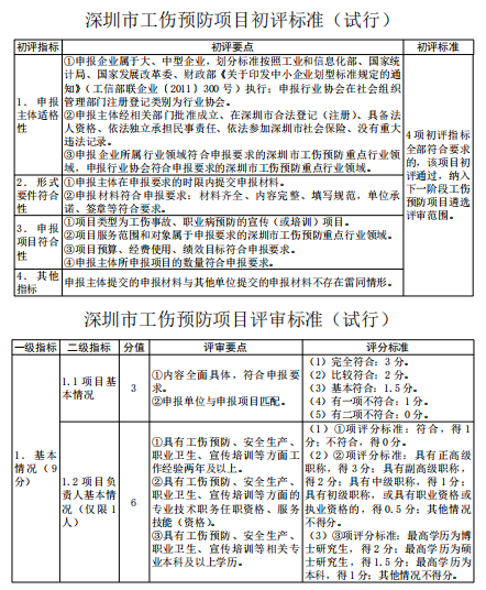 深圳市工伤预防项目初评标准(试行)和深圳市工伤预防项目评审标准(试行)