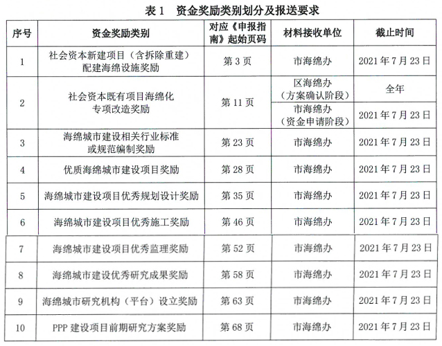 (二)资金奖励类第2项(社会资本既有项目海绵化专项改造奖励)的方案阶段由我办负责初审并出具初审意见,实行常年受理;资金申请阶段由市海绵办主持办理,各申报主体应于2021年7月23日17:30前(逾期不再接收申报材料)将纸质版材料报送至市海绵办。