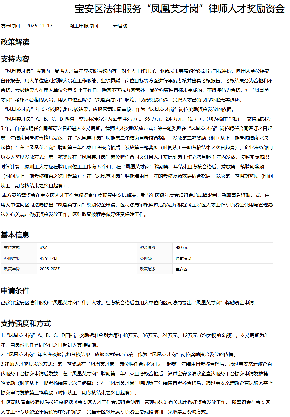 宝安区法律服务“凤凰英才岗”律师人才奖励资金