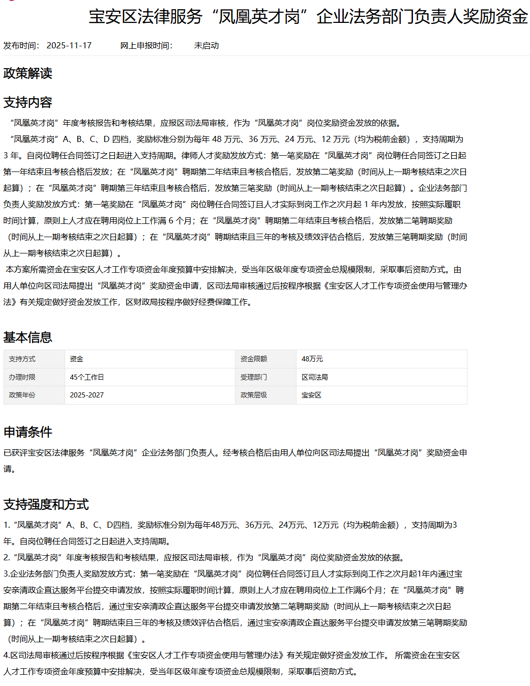 宝安区法律服务“凤凰英才岗”企业法务部门负责人奖励资金