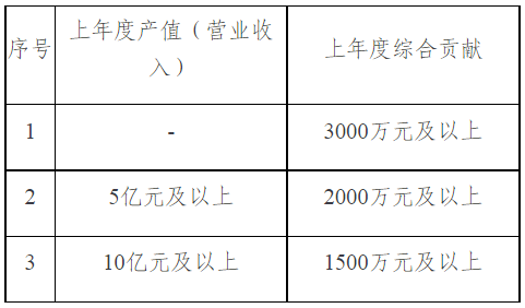 4.在福田区持续经营1年(含)以上,上年度在福田区的综合贡献及纳入福田区统计核算的产值规模(营业收入)符合下列条件之一的: