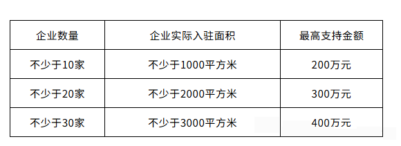 2.支持打造满足人工智能企业集聚发展的产业空间,对于经深圳市龙岗区人工智能(机器人)署认定的区级人工智能产业空间,截至申报指南发布通知日,每个产业空间内实际经营的人工智能企业须同时符合以下条件,给予产业空间运营机构每年相应支持(如下表所示)。每家产业空间运营机构每年最高支持400万元,每家产业空间运营机构每年只能申报不超过两个产业空间。