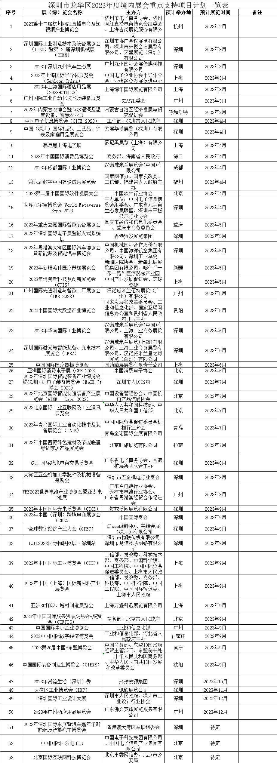深圳市龙华区2023年度境内展会重点支持项目计划一览表