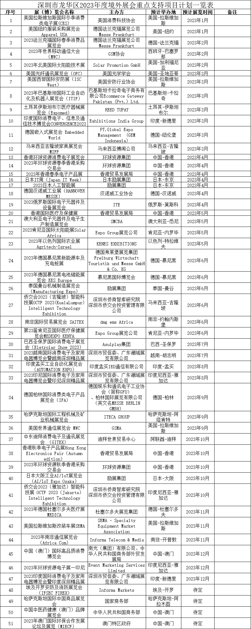 深圳市龙华区2023年度境外展会重点支持项目计划一览表