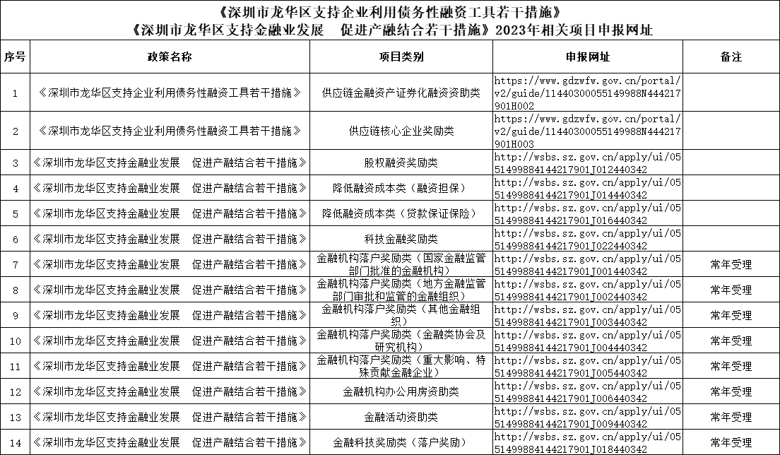 1.《深圳市龙华区支持企业利用债务性融资工具若干措施》《深圳市龙华区支持金融业发展 促进产融结合若干措施》2023年相关项目申报网址