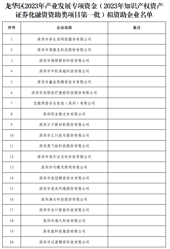 龙华区公示2023年产业发展专项资金(2023年知识产权资产证券化融资资助类项目第一批)拟资助名单