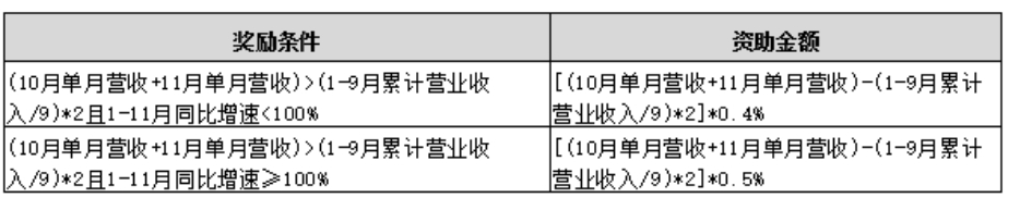 (一)对于10月、11月的单月营收较前9个月平均营收提升的营利性服务业规上主体,若企业1-11月同比增速低于100%,按营收增加量的0.4%给予资助;若企业1-11月同比增速不低于100%,按营收增加量的0.5%给予资助,计算方式如下: