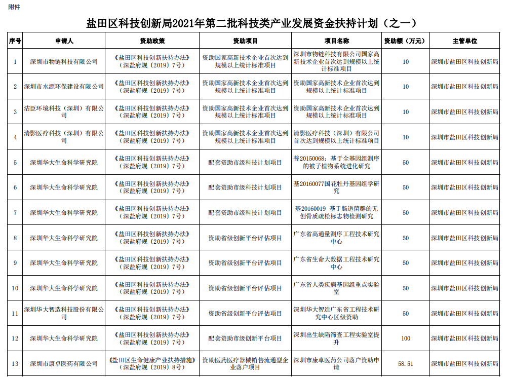 根据《盐田区产业发展资金管理规定》、《盐田区科技创新扶持办法》、《盐田区生命健康产业扶持措施》,经发布指南、材料初审、部门审核、报区产业发展资金领导小组办公室公示、报区领导签批、将签批后的扶持项目方案向区产业发展资金领导小组办公室报备,现下达区科技创新局2021年第二批科技类产业发展资金扶持计划(之一)。有关事项通知如下: