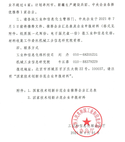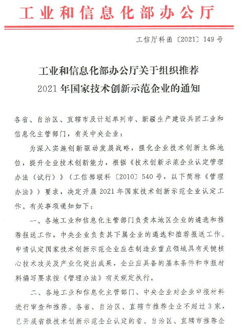 2、工业和信息化部办公厅关于组织推荐2021年国家技术创新示范企业的通知》(工信厅科函〔2021〕149号)