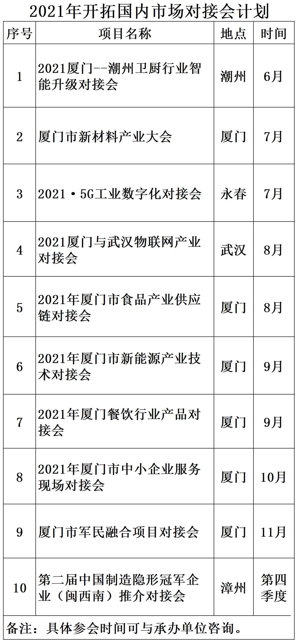 为帮助我市工业企业拓展市场,我局今年将组织企业参加涵盖工信部重点展会、我市千亿产业链、重点发展的战略性新兴产业及传统优势产业等相关展会和我市重点产业的上下游对接、区域对接活动。现将经市政府批准的2021年市工信局开拓国内市场计划印发给你们,请协助组织相关企业报名参展参会。