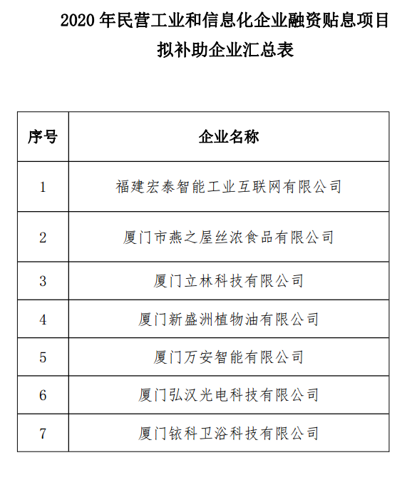根据《中共厦门市委 厦门市人民政府印发〈关于促进民营经济健康发展的若干意见〉的通知》(厦委发〔2018〕26号)、《厦门市工业和信息化局关于申报2020年度民营工业和信息化企业融资贴息项目的通知》精神,经企业申报,并经审核及局内评审等环节,拟对福建宏泰智能工业互联网有限公司等7家企业予以2020年民营工业和信息化企业融资贴息,现予以公示。
